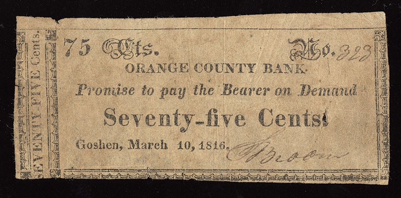 NY. Goshen. Orange County Bank. 75 Cents. Mar. 10, 1816. Unlisted issuer. Signed by S. Broom. "Seventy-five Cents" near the center.