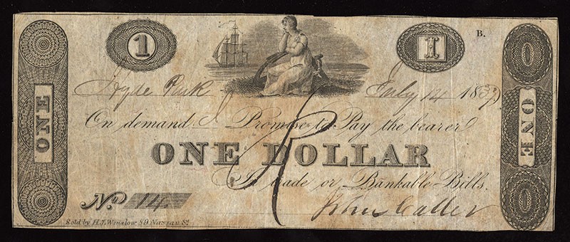 NY. Hyde Park. John Caller. $1. July 14, 1837. (H8) No.14. Hope rests next to anchor. Fine detail. Pen cancel. Age toning.