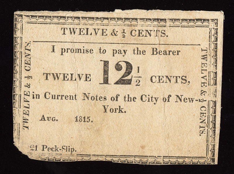 NY. New York. 12 1/2 Cents. Aug. 1, 1815. Not in Harris. Large 12 at the center. Redeemable in notes of the City of New York at 21 Peck Slip. EF detail. Rounded corner. Unissued. Rare.