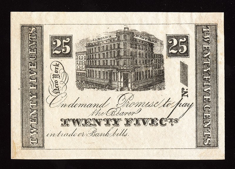 NY. New York. C. Delmonico. 25 Cents. Unlisted by Harris. Proof. Building at 2 South William St. flanked by 25s. AU. Printed on printer's scrap.
