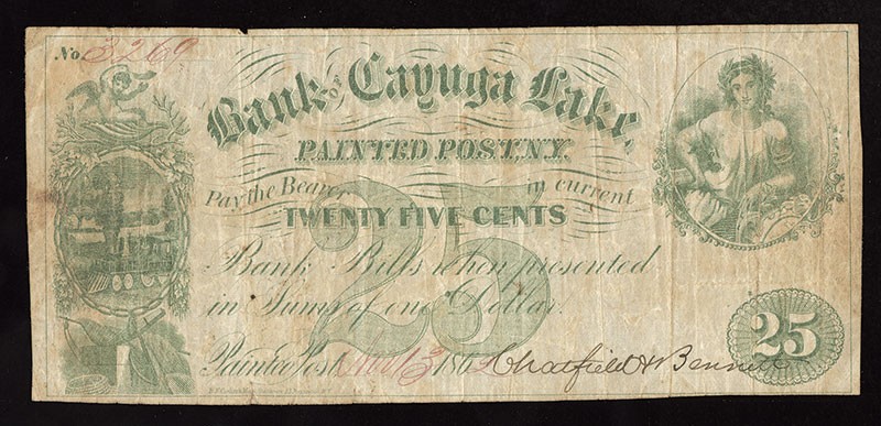 NY. Painted Post. Steuben County. Chatfield & Bennett - Bank of Cyuga Lake. 25 Cents. Nov. 13, 1862. (Like H14, but signed). All green. Fine details, minor edge splits.