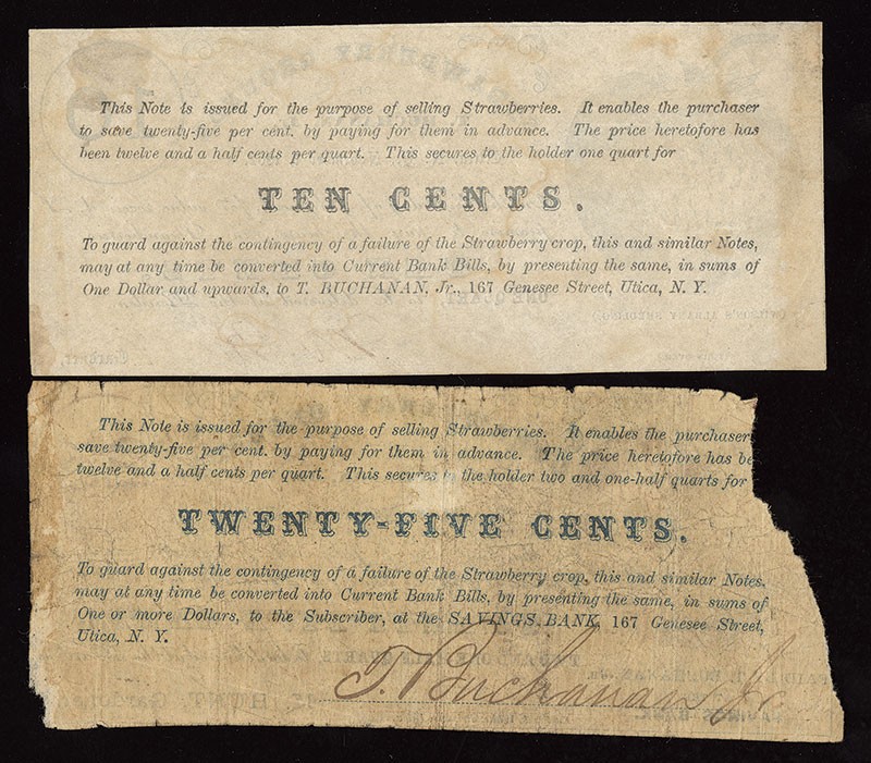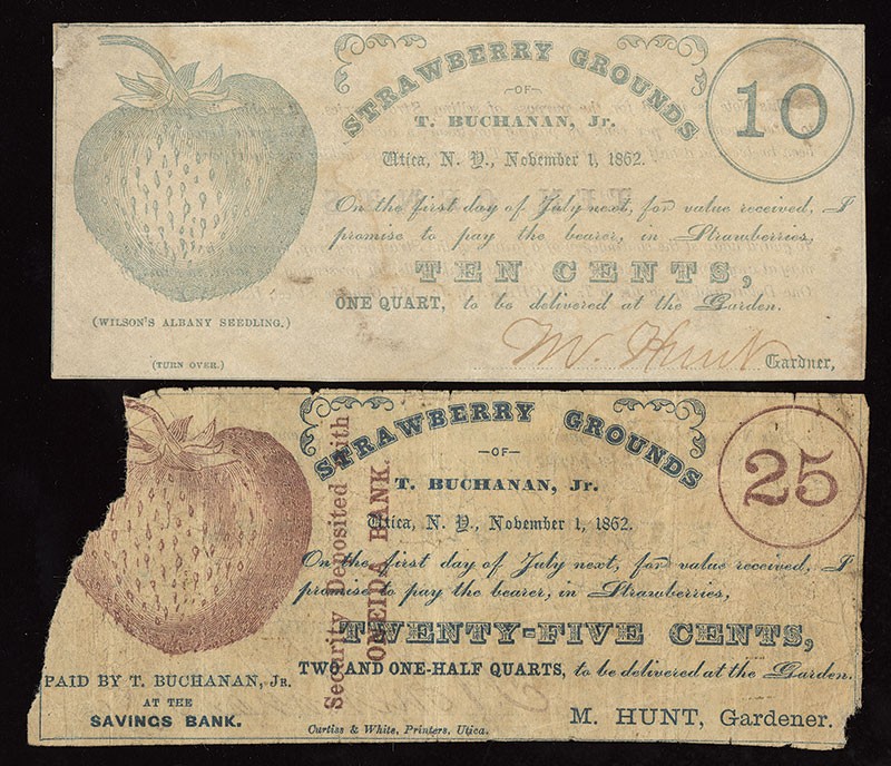 Strawberry Grounds - Oneida Bank. 1) 10 Cents. Nov. 1, 1862. (H231) Blue. Strawberry. (Wilson's Albany Seedling) Fine. A trace of a mounting remnant in the upper left corner. 2) 25 Cents. Similar. Red and blue. Denomination not listed in Harris. Fine detail, but a portion of the left side is gone. [2]