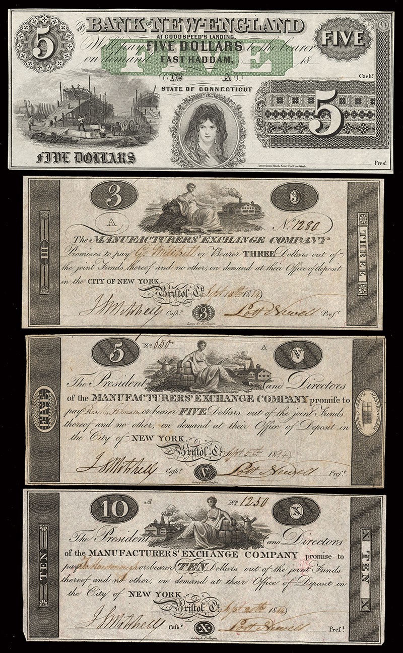 CT. Connecticut Obsolete Bank Note Trio. 1) East Haddam. $5. Bank of New England at Goodspeed's Landing. Green. Veiled woman. Shipbuilding. AU. 2) 1814. Manufacturers' Exchange Company. $3. Payable in New York City. Woman, mill beyond. F-VF. 3) Similar. $10. Woman, bales, factory. F-VF. [3]