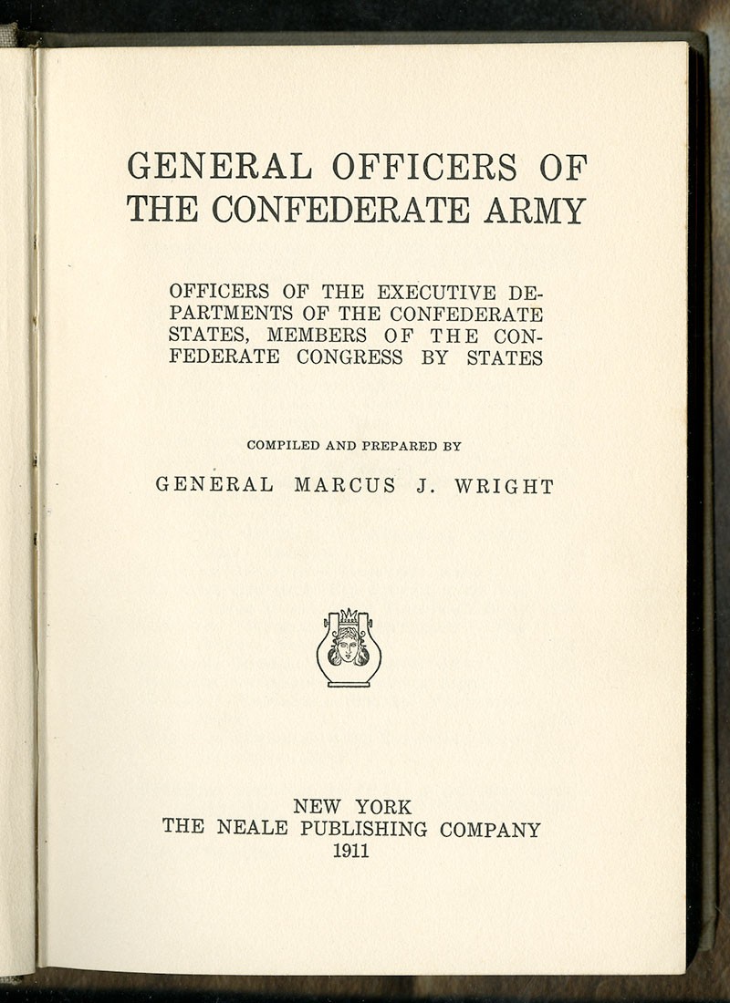 Civil War. Wright, General Marcus Jospeh: General Officers of the Confederate Army-Officers of the Executive Departments of the Confederate States, Members of the Confederate Congress by States. New York; The Neale Publishing Co., 1911. 12mo, grey weave hard covers, 188pp. Lawyer, author and CSA Brig. General, Wright, after 1878, worked as an agent for the U.S. War Department collecting Confederate military records. Light staining on cover, otherwise About Fine.