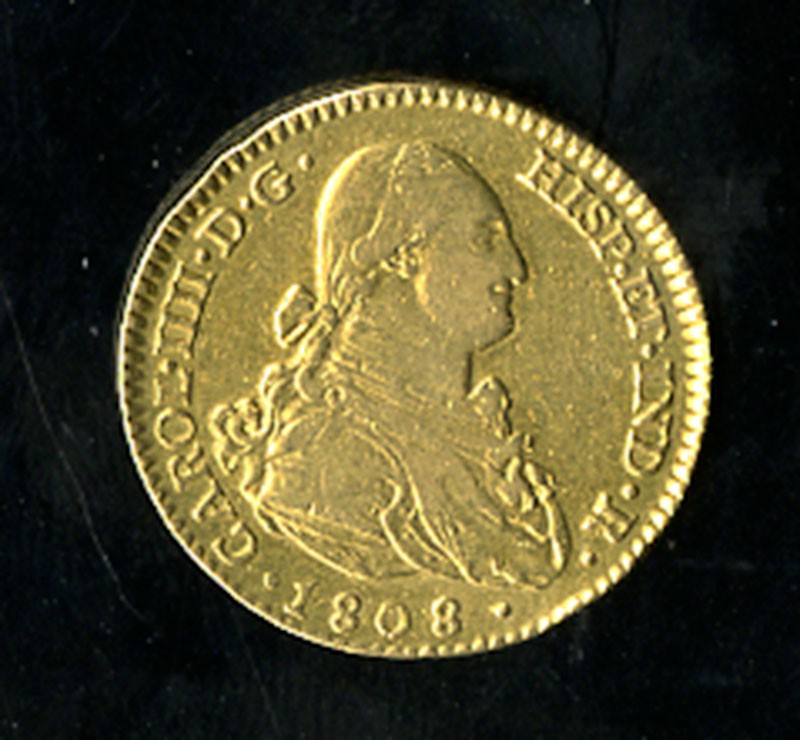 Spain. Carlos IV (1788-1808). 2 Escudos, 1808 AI. Madrid. Armored bust right, rev. Crowned Arms within Order chain. KM 435.1. Ex-mount, Very Fine.