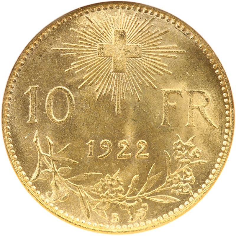 Switzerland. 10 Francs, 1922-B. NGC MS64. Conservatively graded and housed in an early "fat" NGC holder.