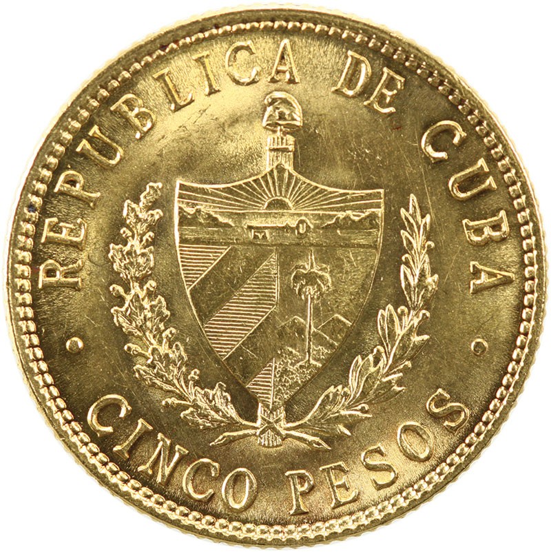 Cuba. First Republic. 5 Pesos, 1916. José Martí head right, rev. Arms. Fr.4, KM 19. Uncirculated.
