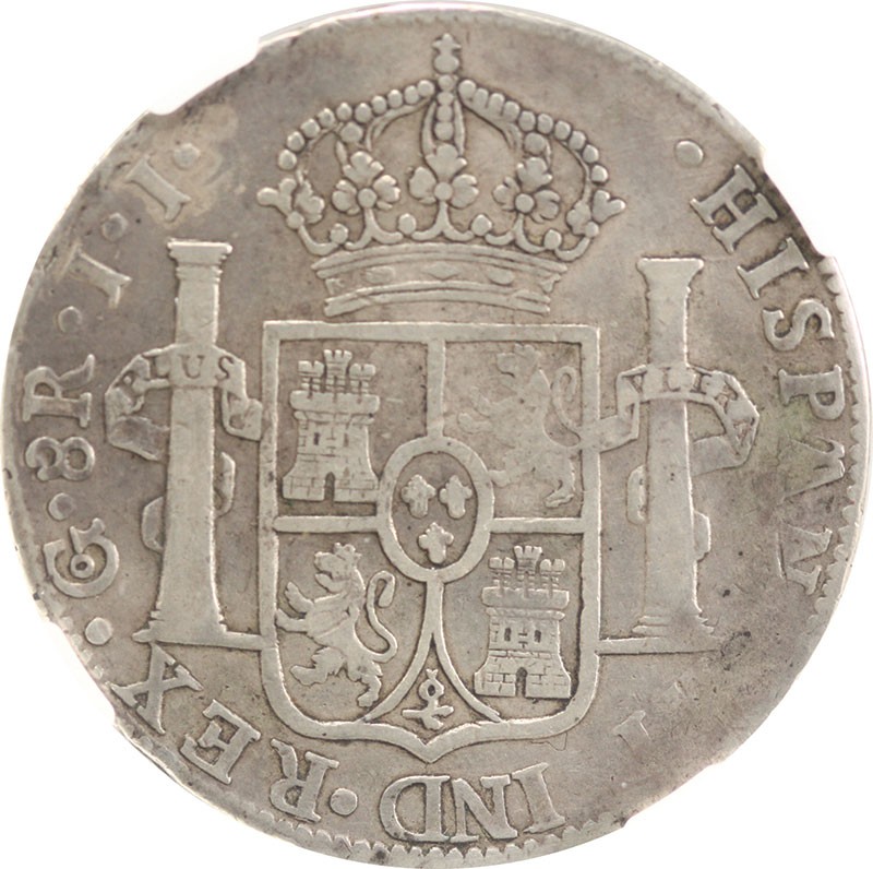Mexico. War of Independence. Fernando VII (1808-1821). Royalist issue. Guanajuato. 8 Reales, 1812 Go JJ. Laureate, draped bust right, rev. Crowned Arms flanked by Pillars. KM 111.4. Surface nicks and hairlines on obverse. NGC VF Details - Excessive Surface Hairlines. Very Rare.