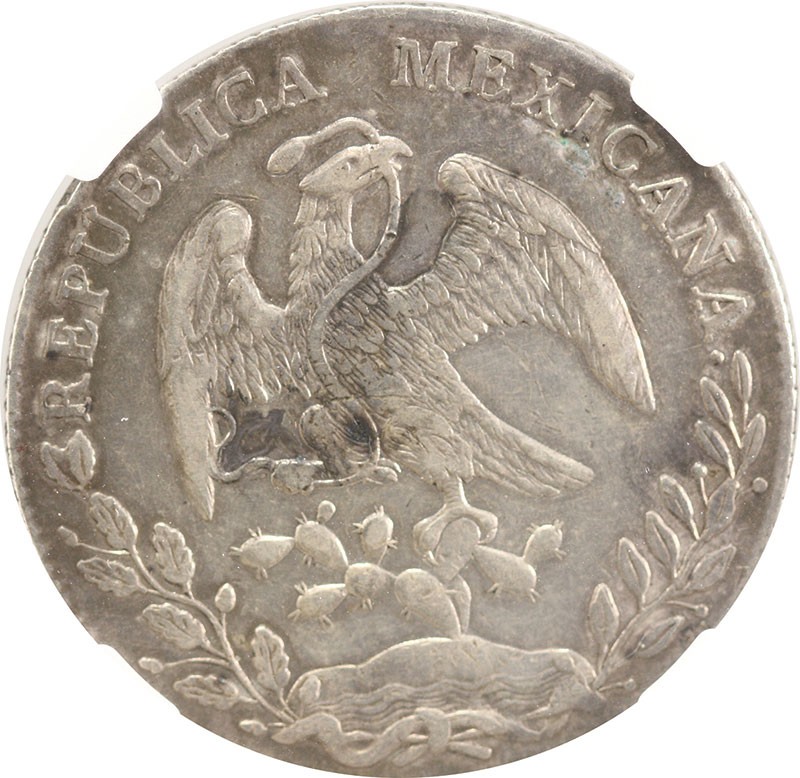 Mexico. Republica. 8 Reales, 1866 A PG. Alamos. Assayer: Pascual Gaxiola. Cap 'n Rays type. KM 377. Rare. Two tiny chops in reverse field. Attractively toned. NGC XF Details - Chopmarked.