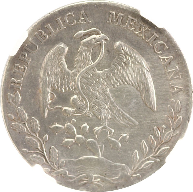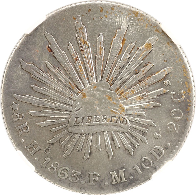 Mexico. Republica. 8 Reales, 1863 Ho FM. Hermosillo. Assayer: Florencio Monteverde. Cap 'n Rays type. KM 377.9. Friction hairlines in fields. NGC AU Details - Excessive Surface Hairlines.