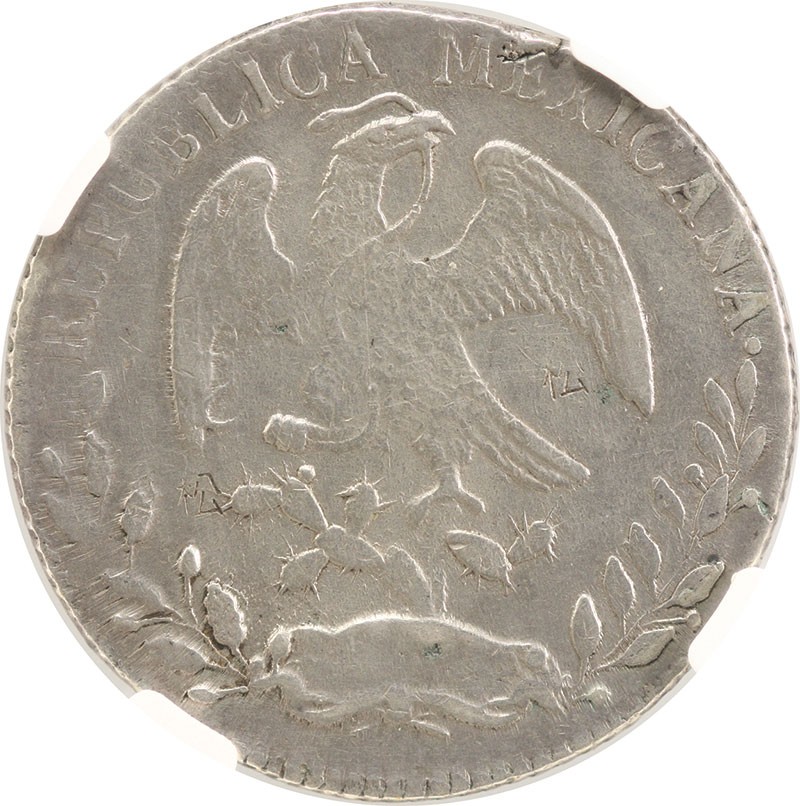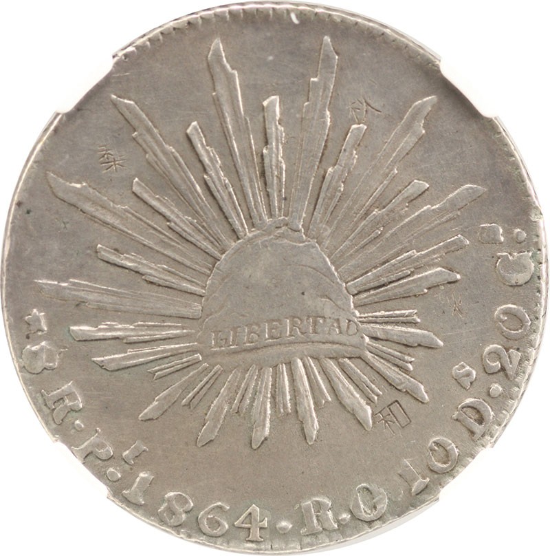 Mexico. Republica. 8 Reales, 1864 Pi RO. San Luis Potosi. Assayer: Romualdo Obregon. Cap 'n Rays type. KM 377.12. Extremely Rare, with only a few specimens known. Three tiny chops obverse field, four reverse. The J.B. Parker specimen was also chopmarked. A MS-64 example (lot 3594) in the Goldberg's Benson Collection Sale, Feb. 2001, sold for $29,325. NGC AU Details - Chopmarked.