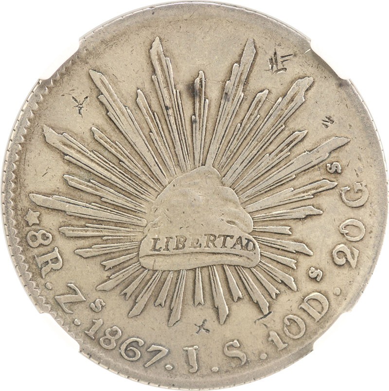Mexico. Republica. 8 Reales, 1867 Zs JS. Zacatecas. Assayer: J.S. de Santa Ana. Fishhook "J" in assayers initials. Cap 'n Rays type. KM 377.13. Very Rare. Two tiny chops obverse, six on reverse. NGC XF Details - Chopmarked.