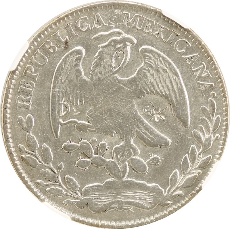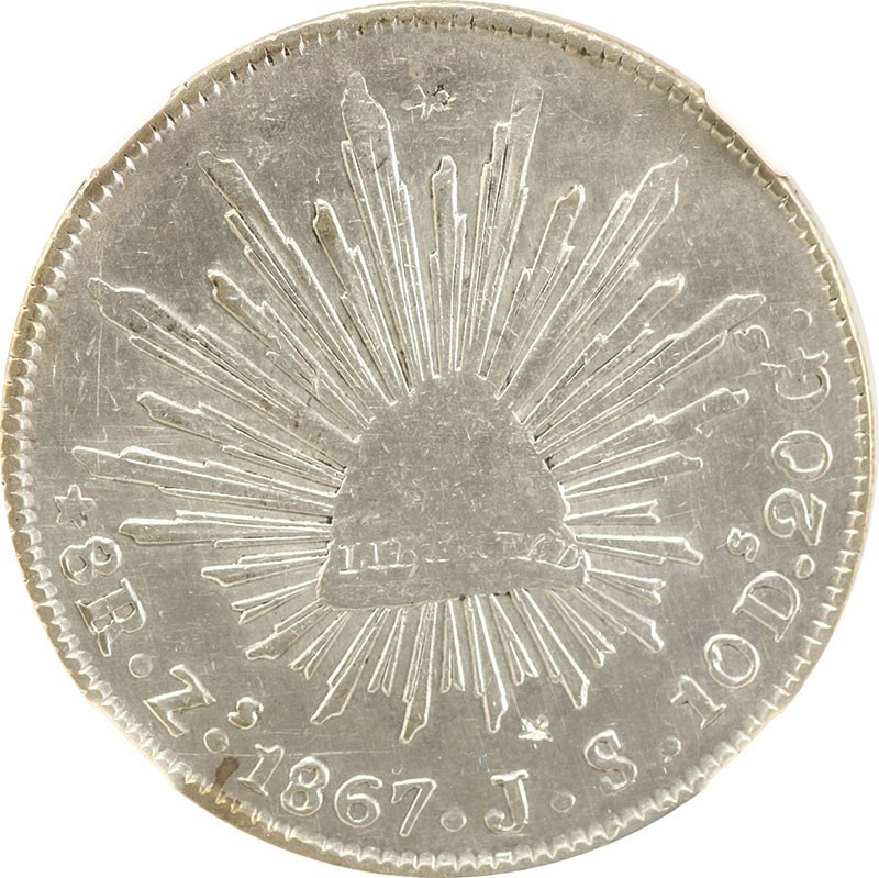 Mexico. Republica. 8 Reales, 1867 Zs JS. Zacatecas. Assayer: J.S. de Santa Ana. "J" in assayer's initials with full bottom loop, large periods in legend. Cap 'n Rays type. KM 377.13. Very Rare. Four tiny chops and test mark on obverse, two tiny chops reverse. NGC AU Details - Chopmarked, Cleaned.
