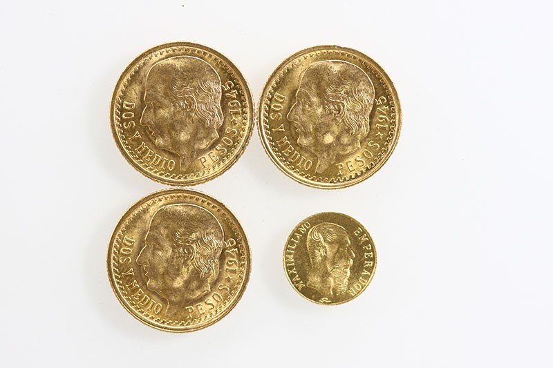 Mexico. Estados Unidos. Quartet of gold: 2 ½ Pesos, 1945 (3). KM 463; and Fantasy Maximiliano miniature "1865" (10mm, 0.49 gms). All Uncirculated. (4)