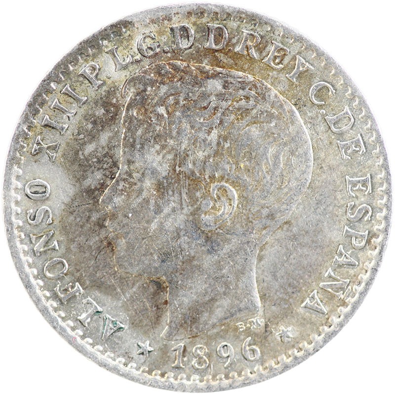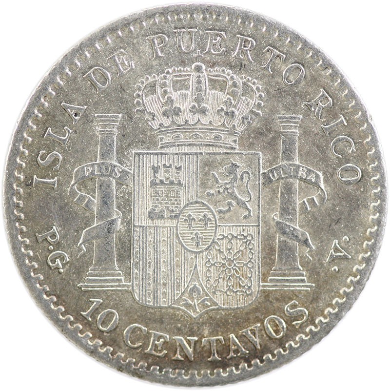 Puerto Rico. Alfonso XIII (1886-1898). 10 Centavos, 1896 PGV. Boy head left, rev. Crowned Spanish Arms flanked by Pillars. KM 21. Toned Good Extremely Fine.