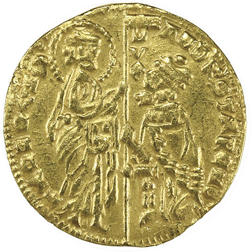Italian States. Venice. Andrea Contarini (1368-1382). Ducat.3.58 gms. Doge kneeling left before San Marco; S.M. VENETI-ANDR. OTARENO-DVX, rev. Christ standing facing within a madorla filled with nine stars. Papa. 1, Paolucci 1, CNI VII, 49. Filemark and possible trace of mount obverse 10:00. Near Extremely Fine.