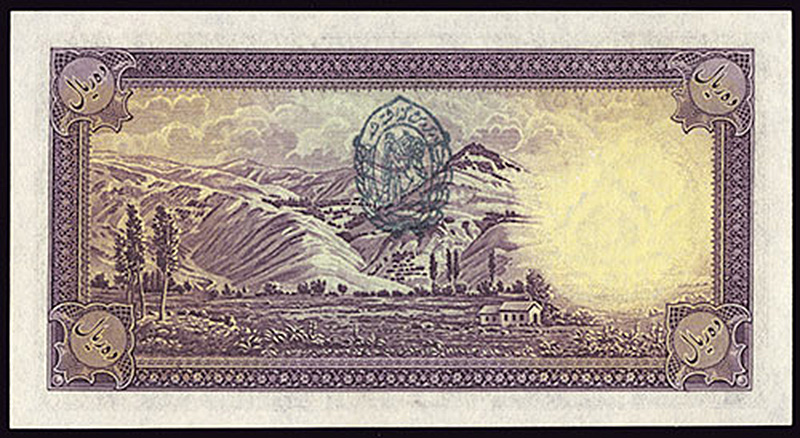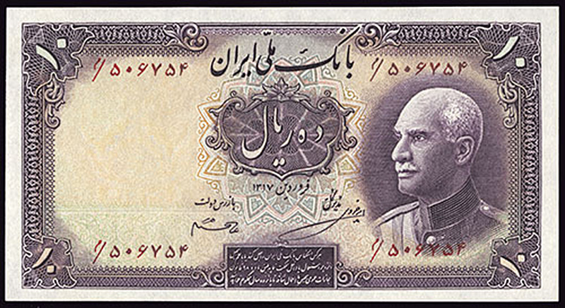 Iran. Bank Melli. 10 Rials. (1938). P-33Ac. Purple on multicolor. Shah Reza. Persian text and blue date stamp on back. AU.