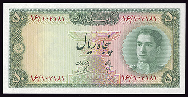 Iran. Bank Melli Iran. 50 Rials. ND (1948). P-49. Portrait of a young Shah in army uniform at right, five figures from Persepolis sculpture on back. Good snap, Choice Uncirculated.