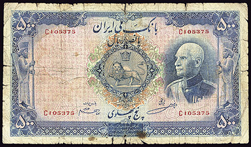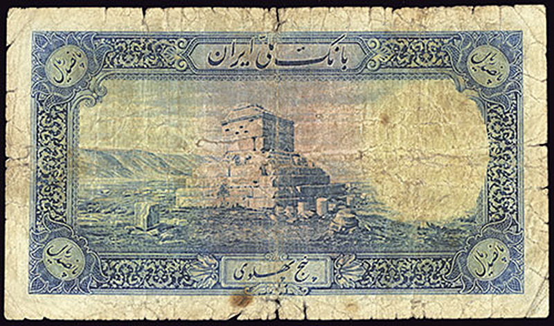 Iran. Bank Melli. 500 Rials. (1938). P-37a. Blue on multicolor. Shah Reza. Persian text Grave of Cyrus on back. VG, with stains.