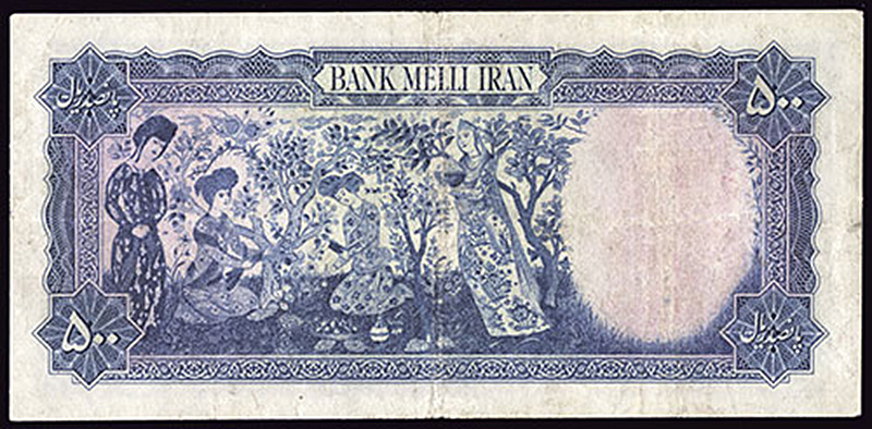 Iran. Bank Melli. 500 Rials. (1951). P-37a. Dark blue, purple and red.. Shah Pahlavi. Four oriental figures in orchard. Fine .