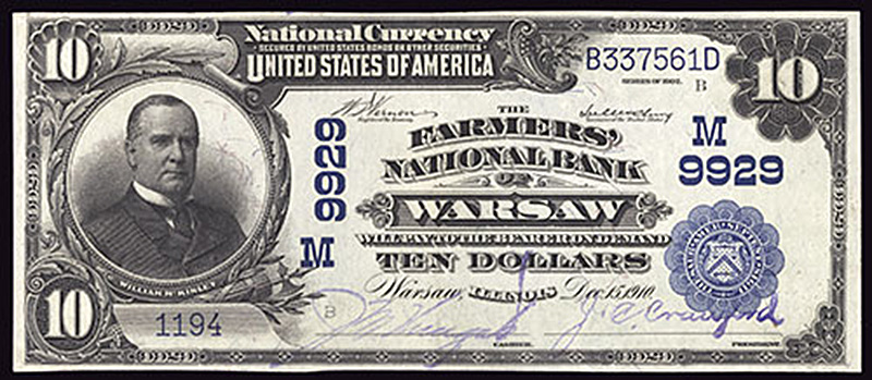 IL. Warsaw. Ch.M9929. Farmers National Bank of Warsaw. $10. 1910 PB. Fr. 627. No.1194/B337561D. Plate B. AU.