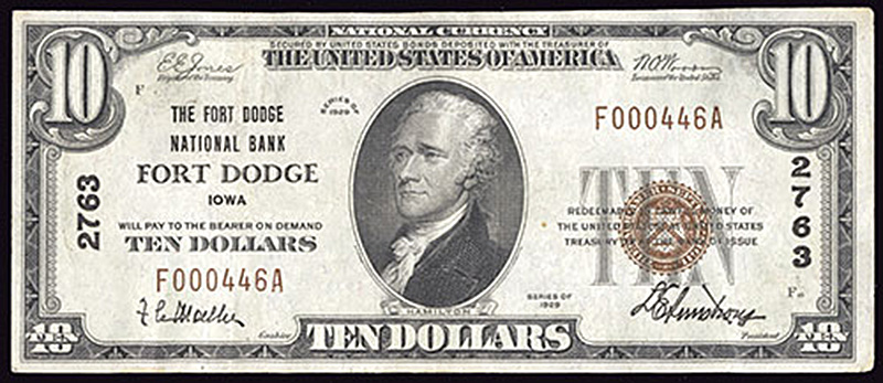 IA. Fort Dodge. Ch.2763. Fort Dodge National Bank. $10. 1929 T1. Fr. 1801-1. No.F000446A. Plate F. VF-EF.