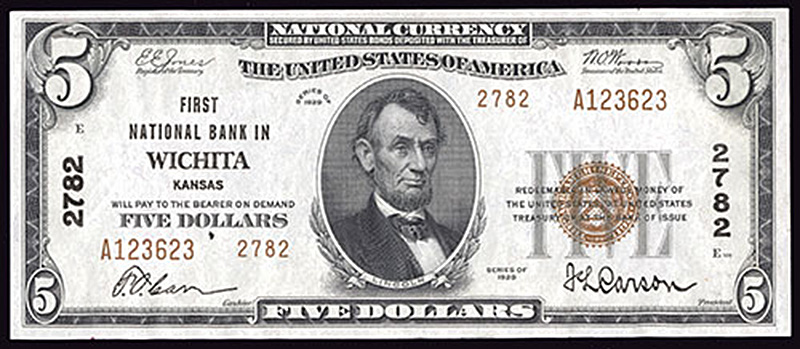 KS. Wichita. Ch.2782. First National Bank in Wichita. $5. 1929 T2. Fr. 1800-2. No.A123623. Plate E. AU.