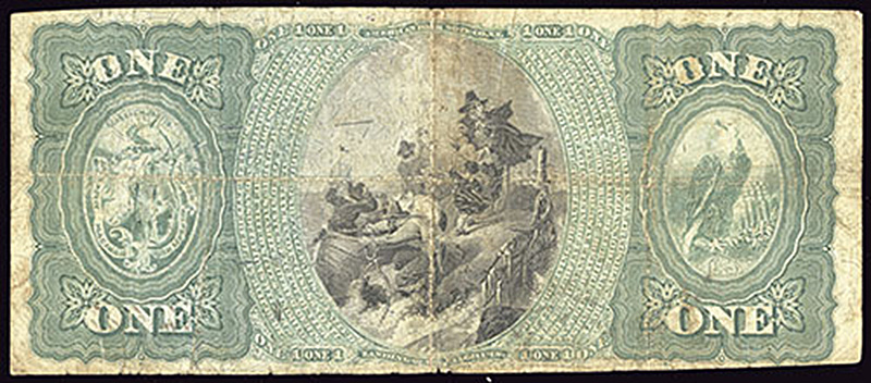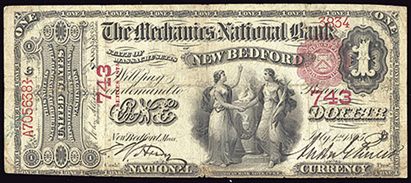 MA. New Bedford. Ch.743. Mechanics National Bank of New Bedford. $1. 1875. Fr. 383. No.3834/A705638. Plate C. F-VF details, some roughness in the bottom border, and there is a small fold junction split in the center.