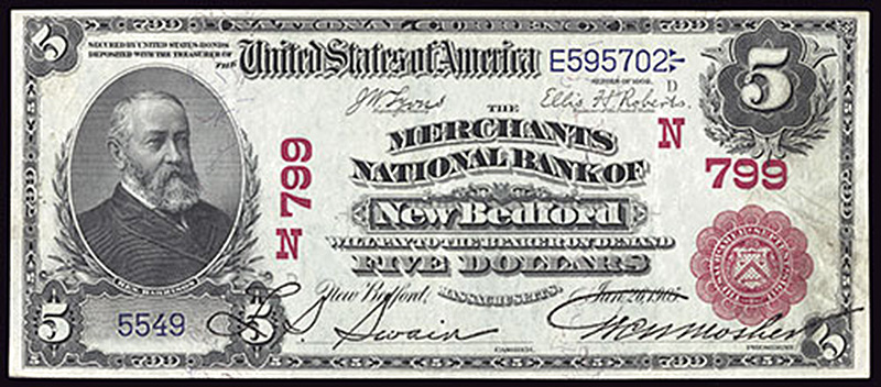 MA. New Bedford. Ch.N799. Merchants National Bank of New Bedford. $5. 1902 RS. Fr. 587. No.5549/E595702. Plate D. VF-EF.