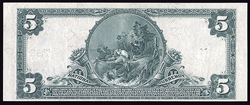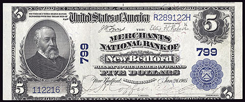 MA. New Bedford. Ch.799. Merchants National Bank of New Bedford. $5. 1902 PB. Fr. 598. No.112216/R289122H. Plate K. EF-AU. Trimmed into the bottom border, but quite bright and attractive.
