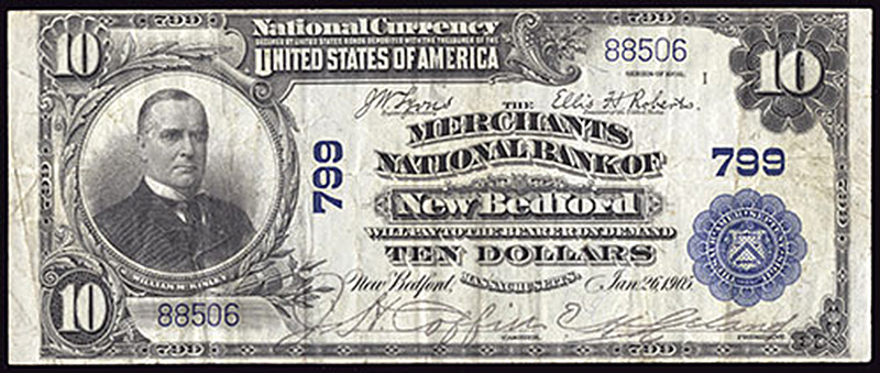 MA. New Bedford. Ch.799. Merchants National Bank of New Bedford. $10. 1902 PB. Fr. 624. No.88506. Plate I. VF. Choice for the grade.