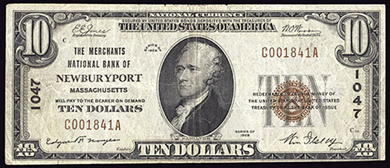 MA. Newburyport. Ch.1047. Merchants National Bank of Newburyport. $10. 1929 T1. Fr. 1801-1. No.C001841A. Plate C. VF.