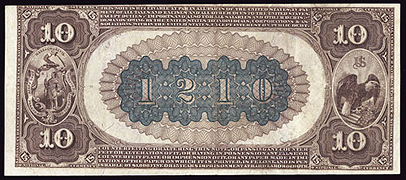 MA. North Adams. Ch.N1210. Adams National Bank of North Adams. $10. 1885 BB. Fr. 468. No.48599/H52407H. Plate F. EF with lovely full margins on the front, vivid colors, and boldly printed design elements. Perhaps the finest Brown Back known on this title. Off the market since 1970.