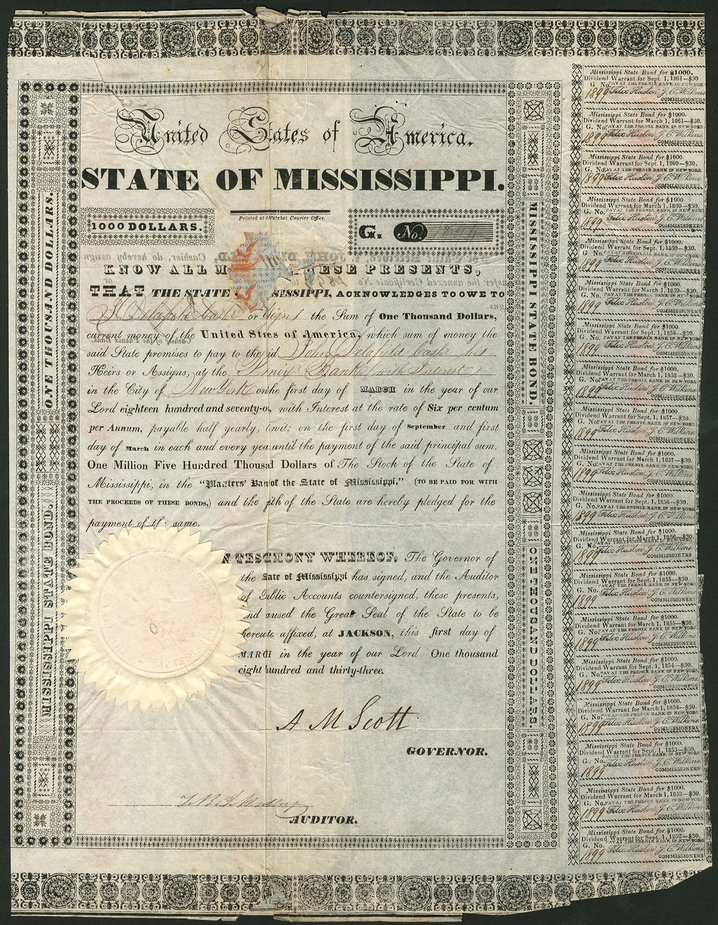 State of Mississippi, 6% 'Planters' Bank' Loan, 1833, bond for $1000, series G, redeemable 1871, #1899, signed by the Governor, attractive engine turned borders, black, with coupons, also with coupon sheet for obtaining interest payments in London, large hole in centre, a few edge tears, poor