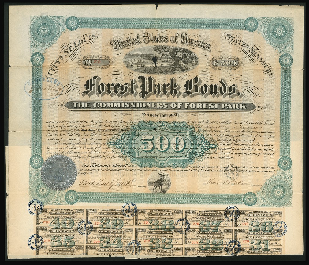 State of Missouri, City of St.Louis, Forest Park 7% Loan, bond for $500, 1872, #270, large format piece with vignette of parkland, deer at bottom, ornate borders, green and black with orange underprint, silver seal, with coupons, some separation along heavy centre folds, F and scarce