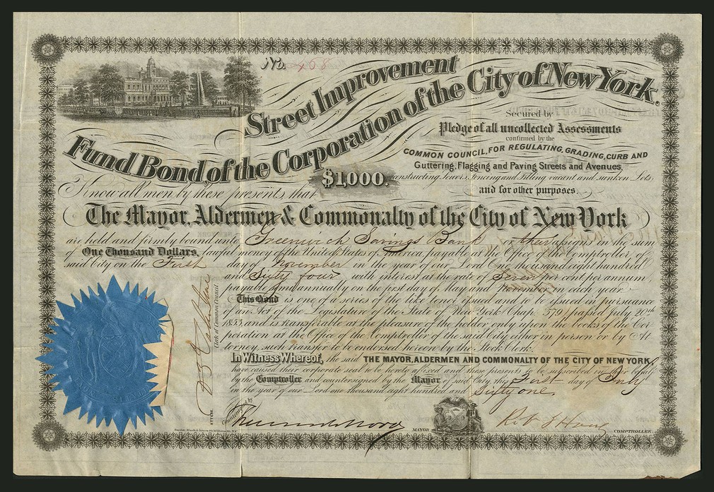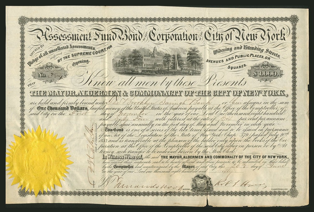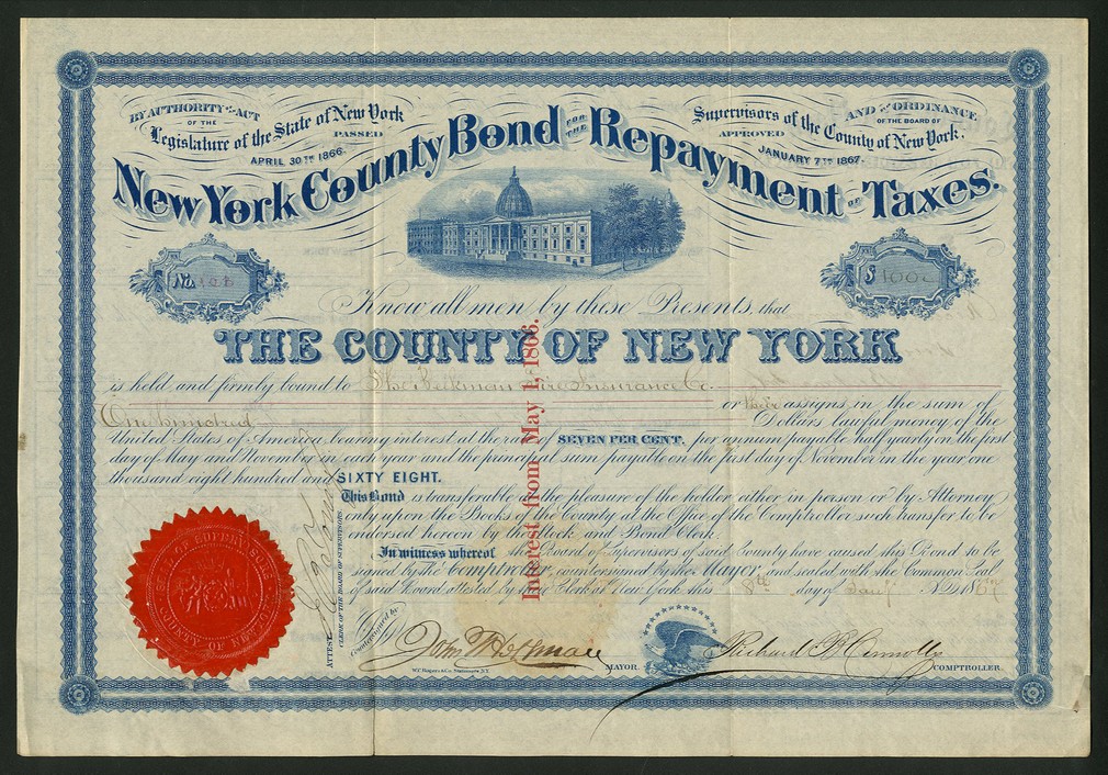 New York County Bond for the Repayment of Taxes, [$100] bond, 18[67], #123, municipal building in centre, blue with red paper seal, together with City of New York bond for the Opening, Widening and Extending Streets etc., $1000, 18[60], building top centre, black with yellow seal, and Street Improvement Bond, $1000, 18[61], building top left, black with blue seal, and, City of Yonkers 7% Water Bond, 187[5], brown and black, the alst cancelled, some edge splits, F-VF. (4)