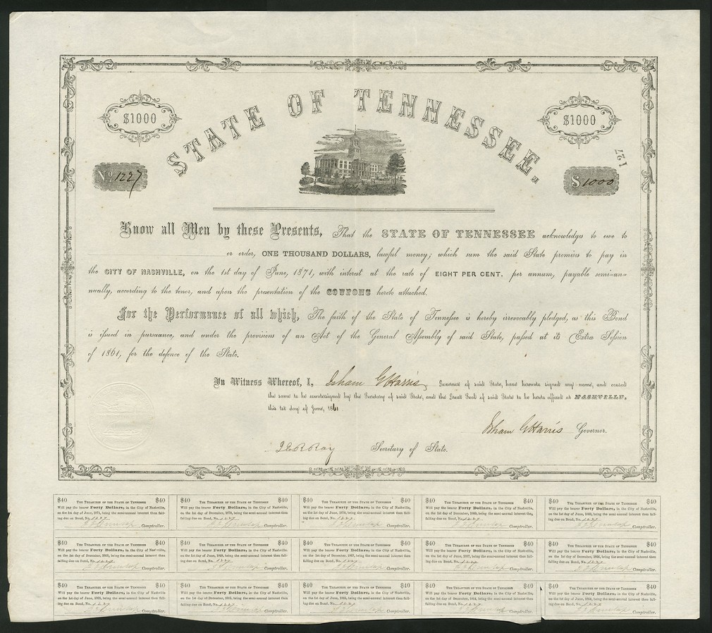 State of Tennessee, $1000 bonds (3) issued under Act of 1861, #1227, #1250 and #1225, vignette of State Capitol top centre, signed by Governor, embossed seal bottom left, EF. (3)