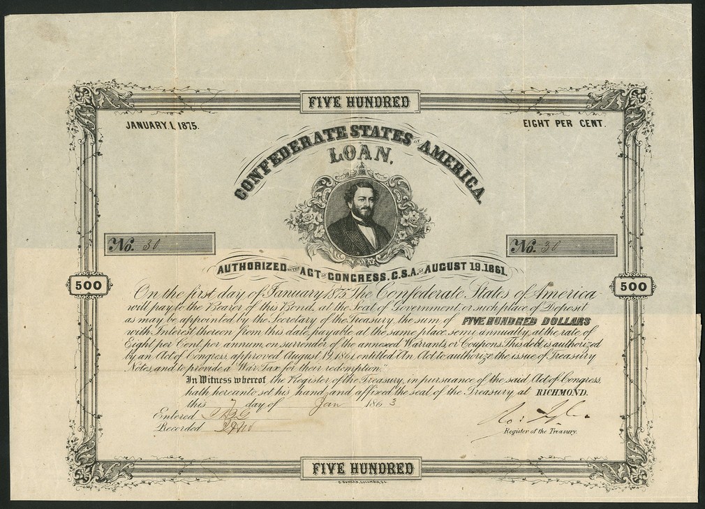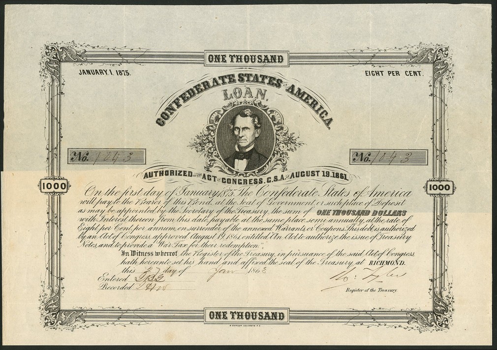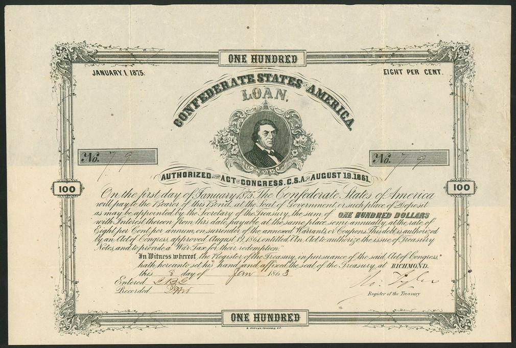 Act of August 19 1861, part set of 8% bonds, for $100, $500 and $1,000, 186[3], redeemable 1st January 1875, vignettes of Hunter, Benjamin and Memminger respectively, with coupons (Ball 88, 89 and 90, Criswell 38,65 and 92), VF. (3)
