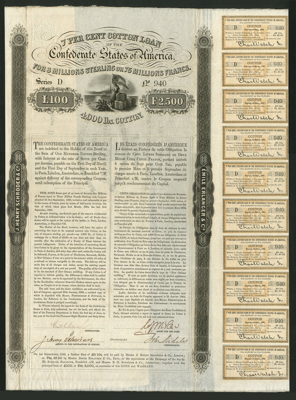 7% Cotton Loan, 1863, bond for £100 or 2,500 francs, #D940, large format with vignette of Confederacy holding flag next to bales of cotton, black, coupons both sides (Ball 156, Criswell 116), VF.