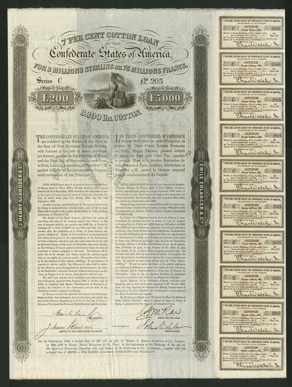7% Cotton Loan, 1863, bond for £200 or 5,000 francs, #C205, large format with vignette of Confederacy holding flag next to bales of cotton, black, coupons both sides (Ball 157, Criswell 117), VF.