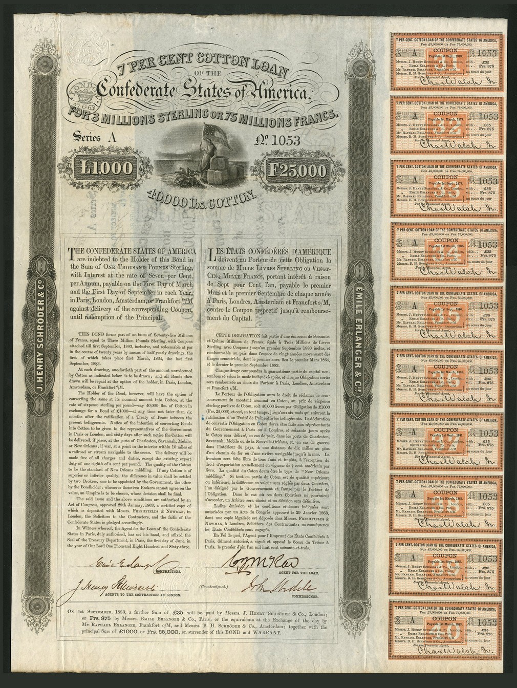 7% Cotton Loan, 1863, bond for £1,000 or 25,000 francs, #A1053, large format with vignette of Confederacy holding flag next to bales of cotton, black, coupons both sides (Ball 159, Criswell 119), VF.