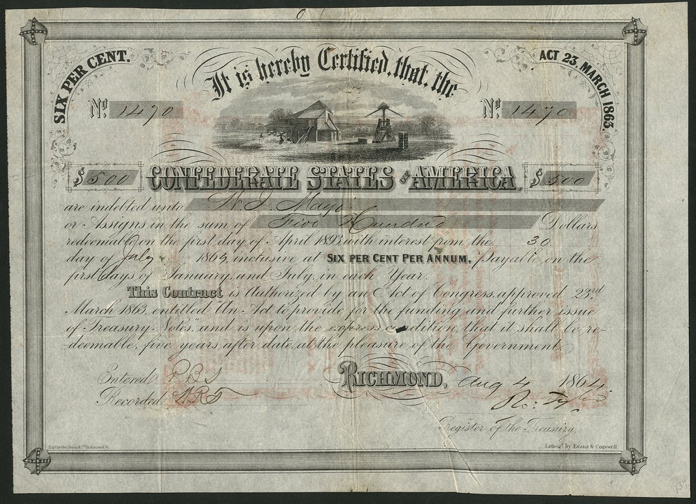 Act of March 23 1863, 6% stock certificate for $ [500], #1470, redeemable 1 April 1893, vignette of cotton gin and cotton press, black (Ball 268, Criswell 134), some splits in folds with minor repairs, GF.