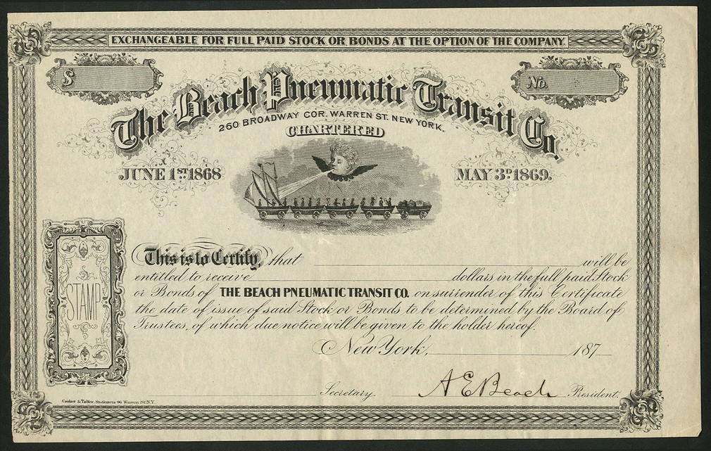 Beach Pneumatic Transit Co. (NY), unissued certificate for stock or bonds, New York 187-, signed by A.E.Beach as President, prculiar vignette of boat-like railway cars with sails, black, with counterfoil, AEF.
