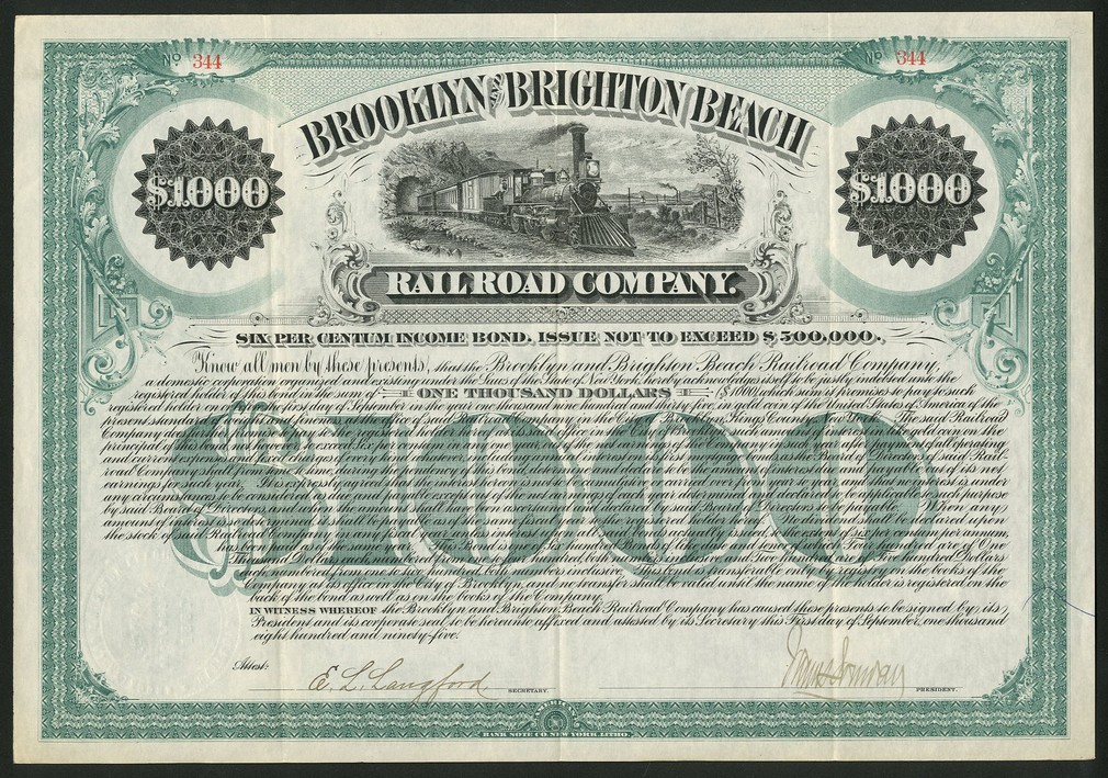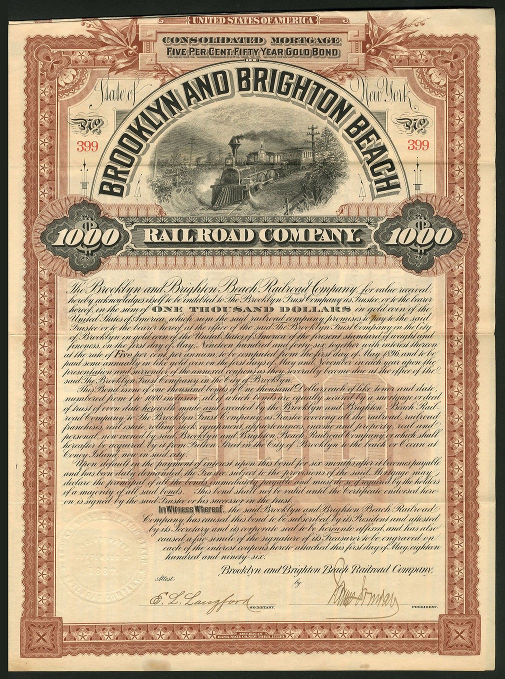 Brooklyn and Brighton Beach Railroad Co. (NY), a pir of certificates comprising 6% income Bond, $1000, 1895, #344, steam train top centre, green and black, together with Consolidated Mortgage 5% 50-Year Gold Bond, $1000, 1896, no.399, steam train top centre, brown and black, with coupons, both are not cancelled, GVF. (2)