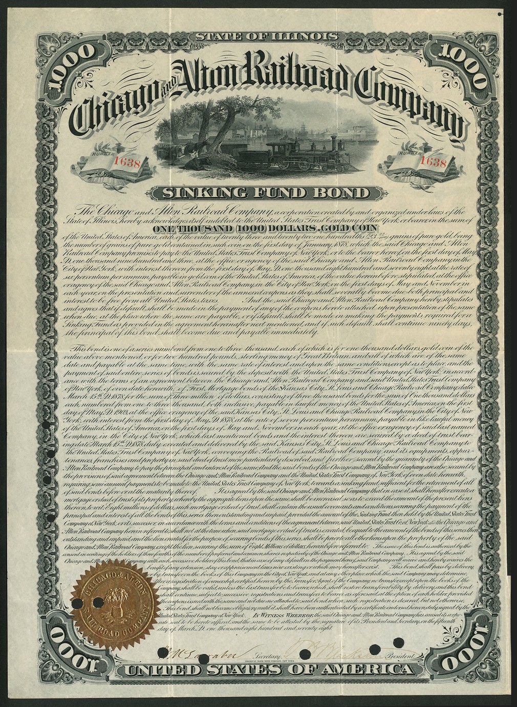 Chicago and Alton Railroad Co. (IL), Sinking Fund bond for $1000, 1878, #1638, steam train with river scene in background, black, gold seal, neatly hole cancelled, with coupons, VF