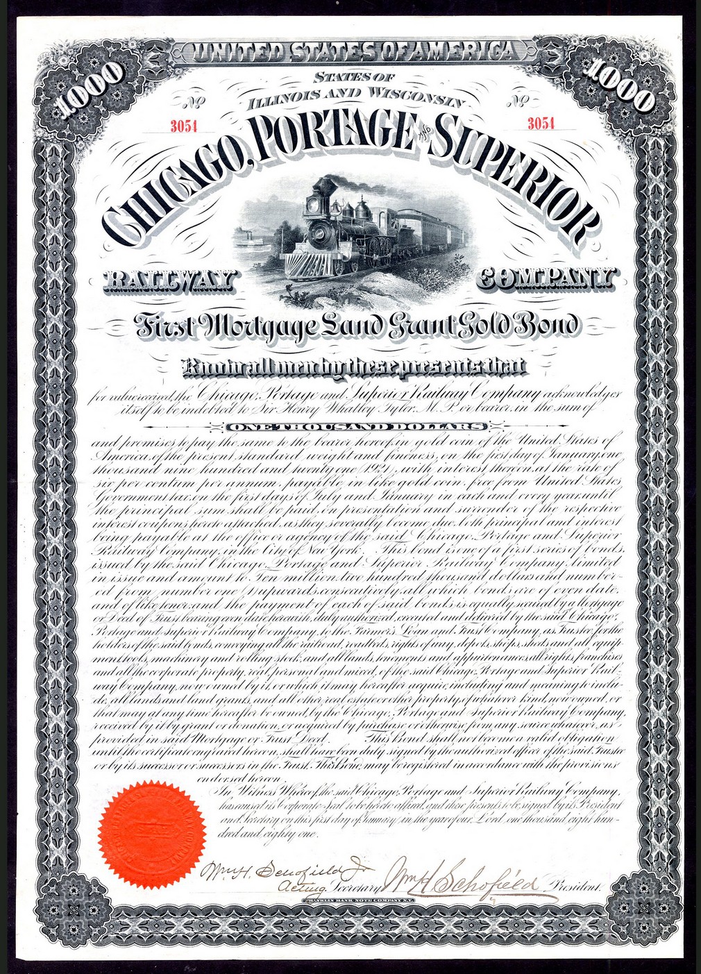 Chicago, Portage and Superior Railway Co. (IL & WI), First Mortage Land Grant Gold Bond, $1000, 1881, #3054, steam train at top, ornate border, black, red seal, printed by Franklin Bank Note Co., with coupons, not cancelled, GVF.