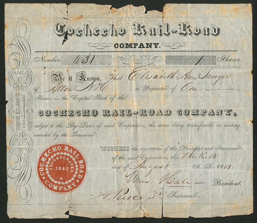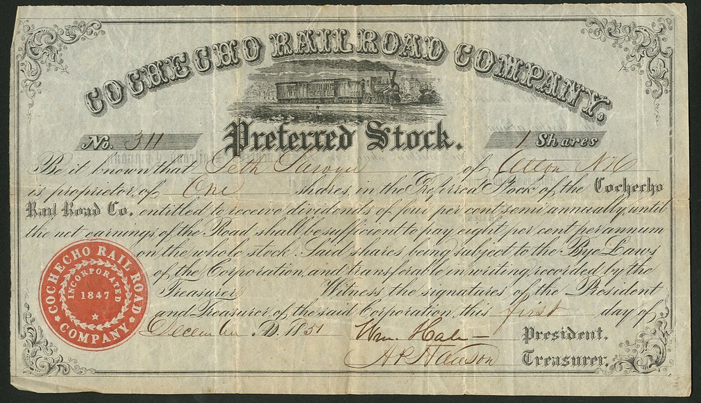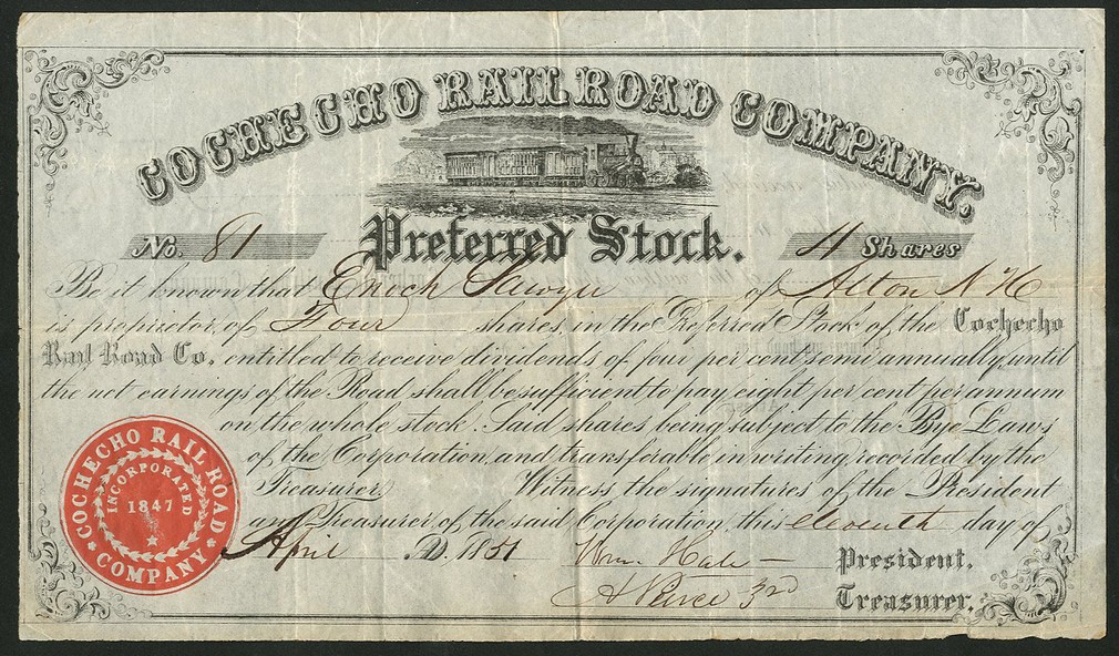 Cochecho Railroad Company, capital stock, 18[51], black, red seal; together with preferred stock, 18[51], 3 examples, vignette of steam train, black, red seal, the first toned with much edge damage, the last three generally AVF but one with some toning. (4)