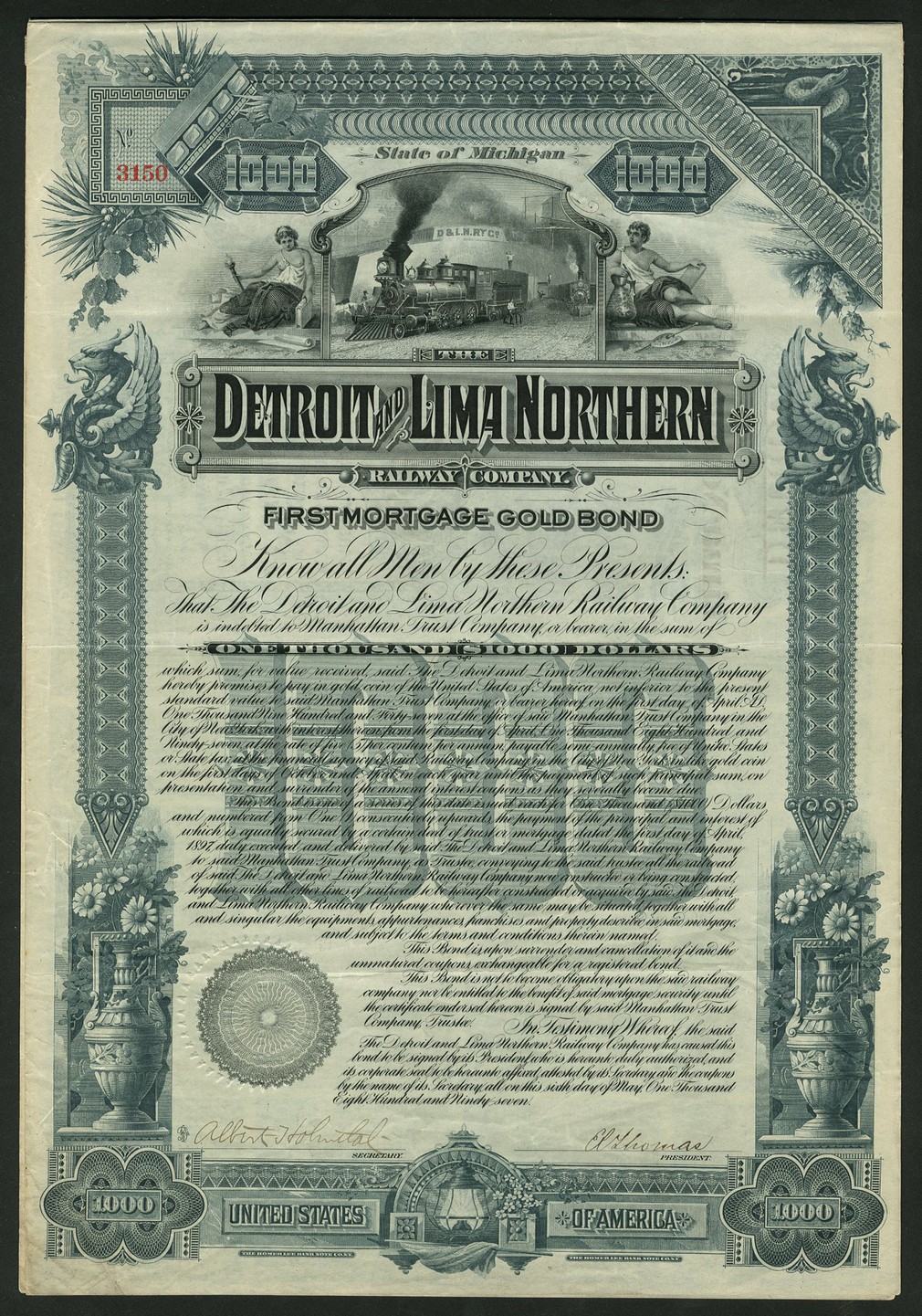 Detroit & Lima Northern Railway Company, First Mortgage Gold Bond for $1000, 1897, #3150, vignette of locos in station and decorative borders, slate grey with coupons, EF.