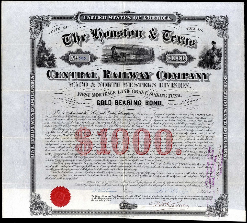 Houston & Texas Central Railway Company (Waco and North Western Division), First Mortgage Land Grant Gold Bond, $1000, 1873, #949, signed by W.E.Dodge as President, very large format piece with steam train top centre, indians to left and allegorical female to right, black, red underprint '$1000' and red seal, with coupons, GVF