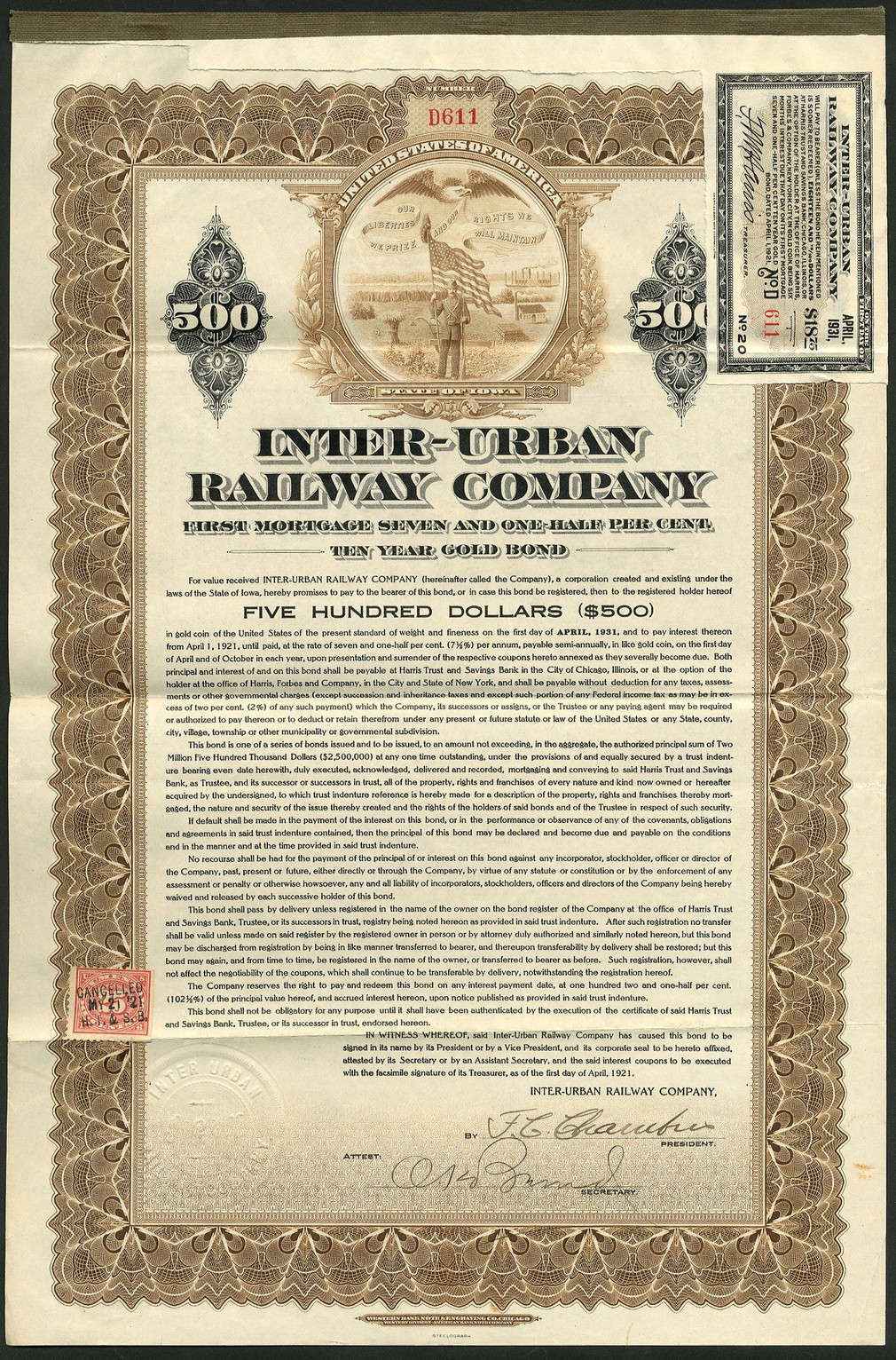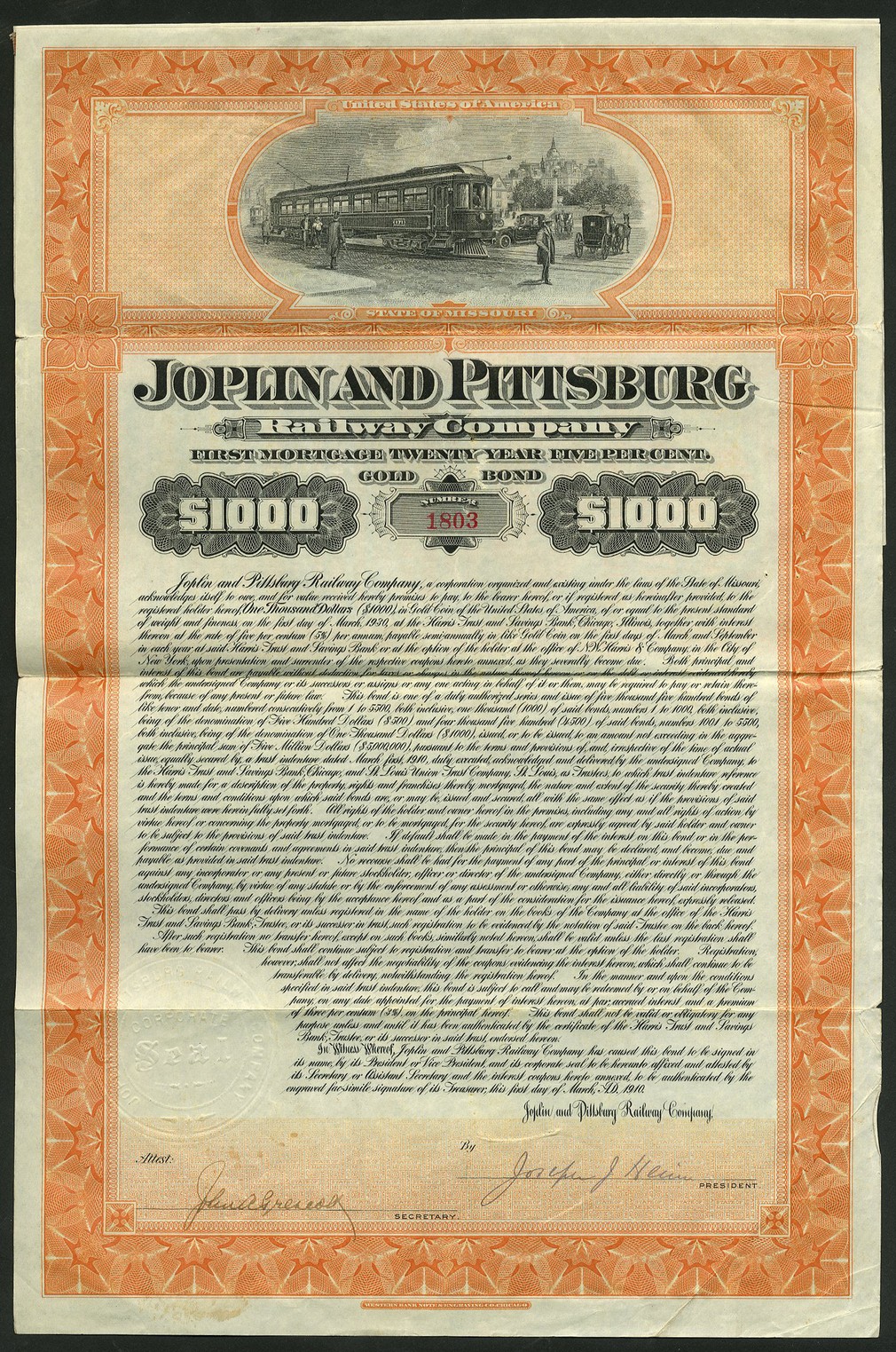 Joplin & Pittsburg Railway Co. (MO), First Mortgage 5% Gold bonds for 500 and $1000 (2), 1910, street car with automobile and horse & carriage, green and orange respectively, with coupons, together with Inter-Urban Railway Co. (IA), First Mortgage 7½% Gold Bond, $500, 1921, soldier with union flag at top, brown, with coupons, one or two edge nicks but generally VF, the last unlisted in Cox. (4)